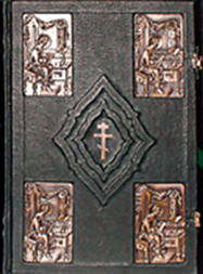Переплёт ручной работы из улучшенной натуральной кожи. Библия закрывается на две застёжки, выполненные по образцу 18 века. На лицевой стороне обложки металлические накладные крест и клейма. Издание выпущено тиражом 800 экз. Каждый экземпляр книги имеет свой номер.