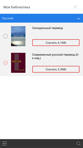 Текущая версия приложения имеет несколько бесплатных вариантов переводов Библии, доступных для скачивания: на русском, английском, португальском, испанском языках (список переводов доступных для приобретения и скачивания будет расширяться).