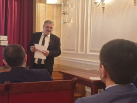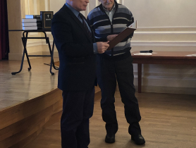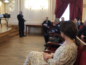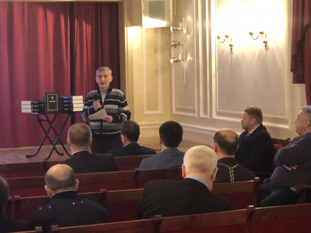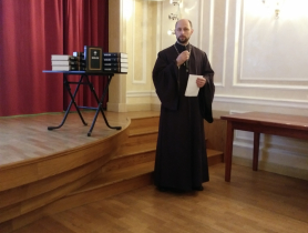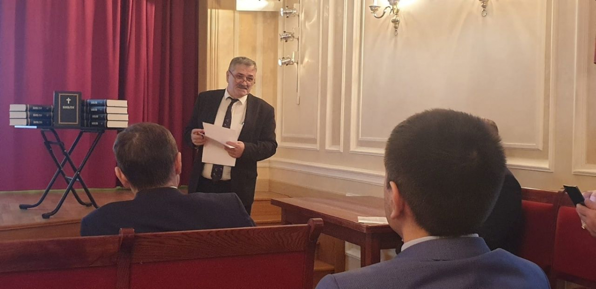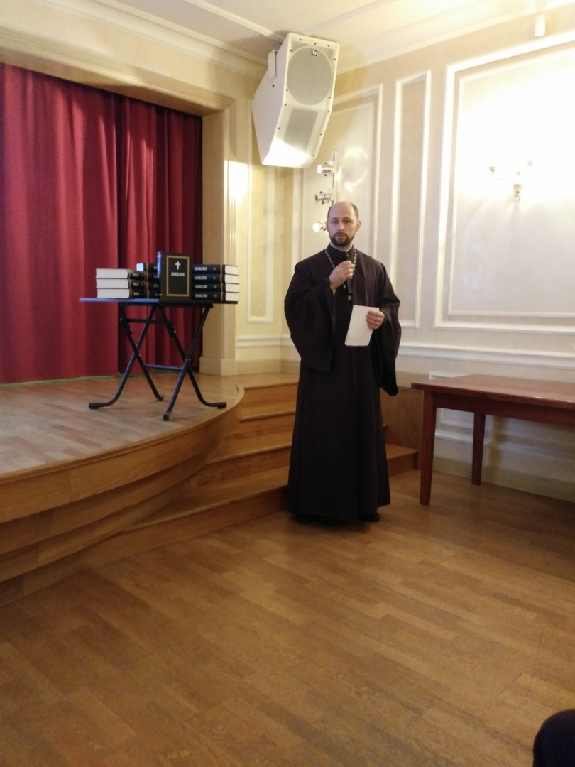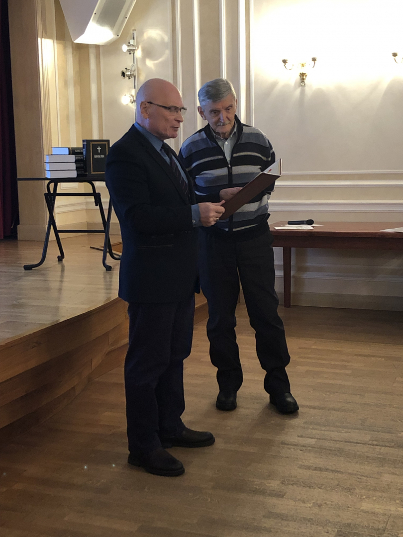 С докладом на тему «1100-летие крещение Алании: ретроспектива и современность» выступил д.ф.н., профессор кафедры массовых коммуникаций РУДН Валерий Таказов. Зрителям представил видео-презентацию о проекте по переводе Библии на осетинский язык Александр Столяров. За свой вклад в работу проекта Александра Валерьевича наградили почетной грамотой от Главы РСО-Алания. А также произошла церемония передачи Библии на осетинском языке руководству осетинского землячества в СПб и ЛО. Председатель осетинского землячества Петр Наниев выразил слова благодарности участникам проекта и создателям экземпляра, пожелал всех благ.