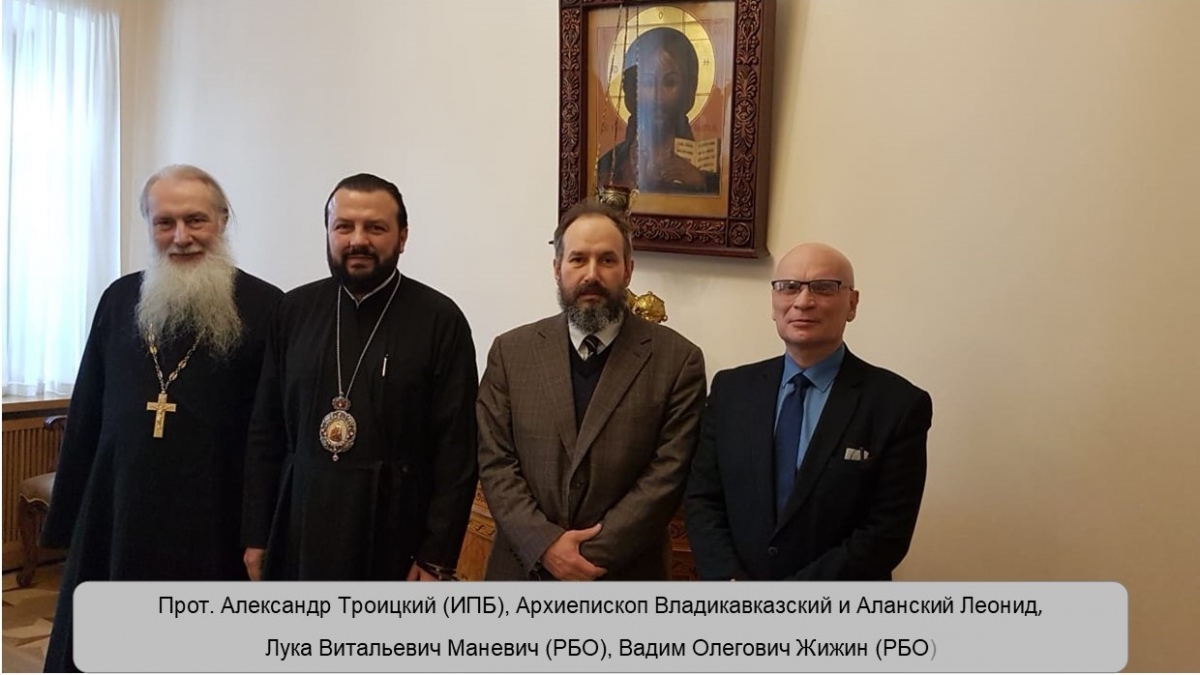 16 марта 2020 в Москве в Отделе внешних церковных связей Московского Патриархата РПЦ состоялась встреча Архиепископа Владикавказского и Аланского Леонида с представителями Института перевода Библии (ИПБ) и Российского Библейского Общества (РБО).От ИПБ на встрече присутствовал протоиерей Александр Троицкий, Председатель Правления Института перевода Библии с 2003 г., от РБО – Анатолий Александрович Руденко, Исполнительный директор, Лука Витальевич Маневич, научный сотрудник и Вадим Олегович Жижин.А.А.Руденко рассказал о планах Библейского Общества по завершению проекта перевода Библии на осетинский язык и планах по изданию полной Библии. Протоиерей Александр Троицкий проинформировал собравшихся о работе ИПБ по переводу Нового Завета, который входит в состав полной осетинской Библии. В.О. Жижин и Л.В. Маневич дали исчерпывающую информацию по текущей работе над проектом перевода и подготовкой издания к выходу в свет.