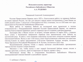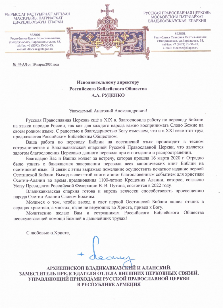 19 марта 2020 г. Архиепископ Владикавказский и Аланский Леонид направил в адрес РБО письмо, в котором выразил свою благодарность сотрудникам Библейского Общества и пожелание осуществить печатное издание первой осетинской Библии к дням празднования 1100-летней годовщины Крещения Осетии-Алании.